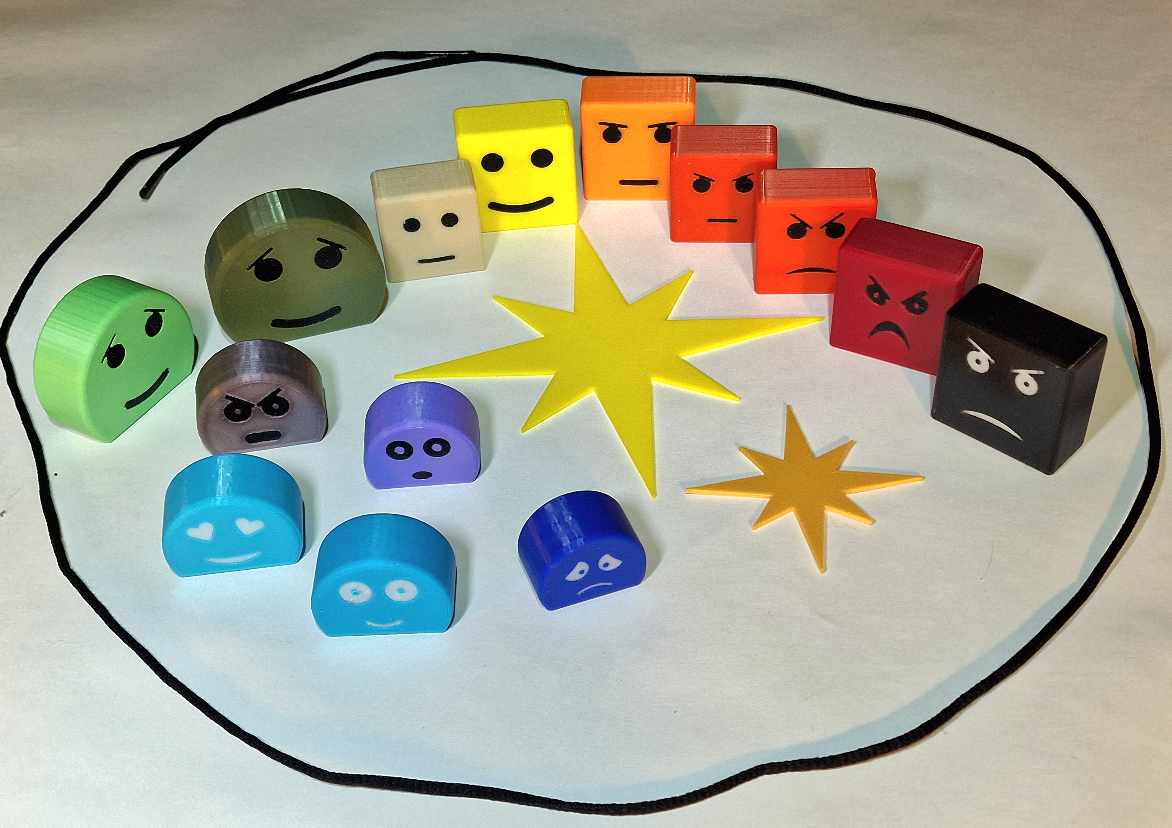 Für eine Aufstellung aus der Beobachterperspektive eignen sich die kleineren Ego States Minis. Die 14 Figuren sind bis 5 cm gross und können z.B. auf einem Tischchen aufgestellt werden. Sie entsprechen den Farben der Ego States Konstellation. Mit dabei sind zwei gelbe Sterne für das regulierende Selbst und ein schwarzer Bändel für die Symbolisierung der Aussengrenze. Das ganze Set kostet 85 Fr. (zusätzlich Versandkosten von Fr. 5.-) Eine Stofftasche aus Baumwolle wird mitgeliefert.